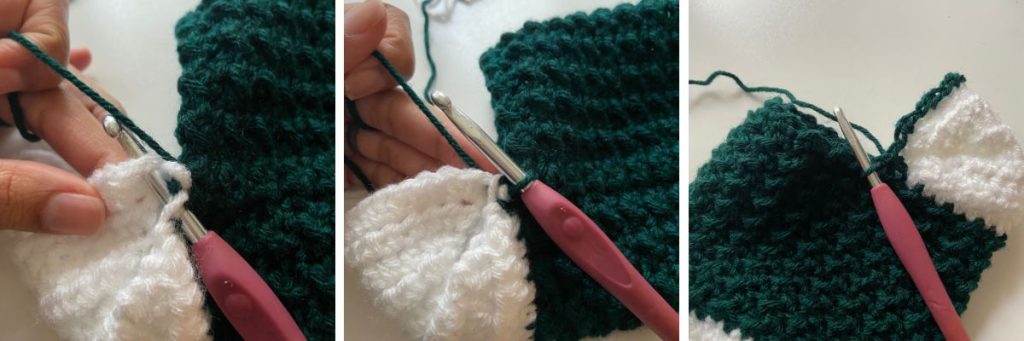 This section will have two increasing rows. Increases will be worked worked at the edges of the heel and completed as [hdc, sl st, hdc] in the same space.