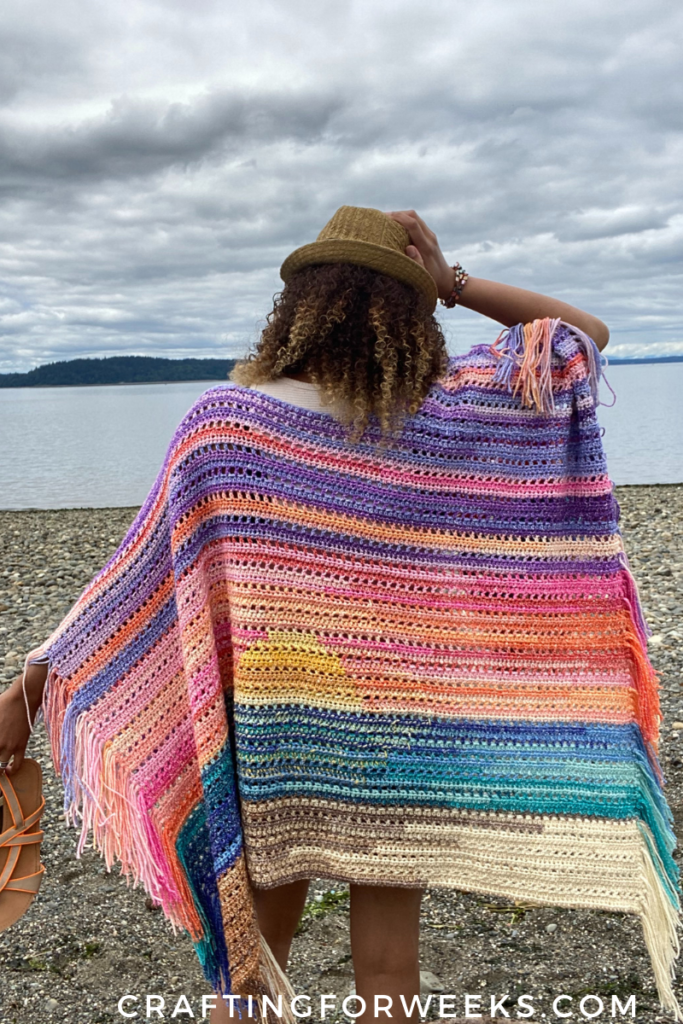 As I mentioned before, I used the Half double crochet Fade Stitch in my Summer Nights Ruana. I wanted the setting sun to “reflect” off the water in that piece, so I needed splashes of yellow in my blue. This technique gave be the subtle color accent I needed. You can find the free pattern on the E’Claire Makery blog here! You can also purchase the PDF in my Etsy or Ravelry shop.