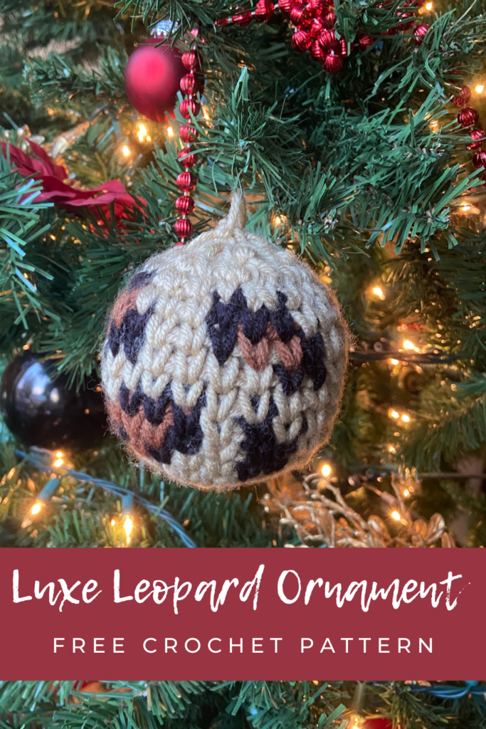 The Luxe Leopard Ornament is a bauble-style ornament. It uses tapestry crochet techniques to create effect of leopard spots. And it showcases a knit-look stitch that gives these ornaments a cozy feel.
