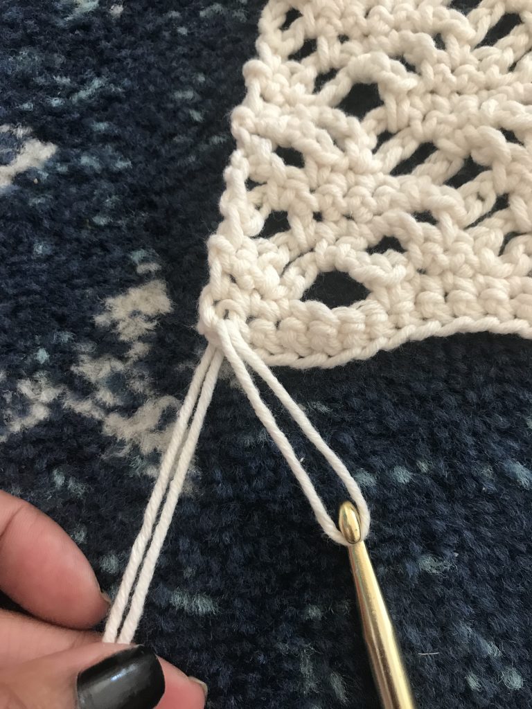 - Fold each strand in half. Insert hook into the first stitch and pull up the center of the strand.