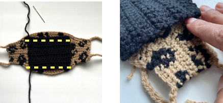 4) Fasten off and cut any extra. Repeat with bottom corner of mask. Repeat on opposite side.