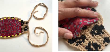 3) Using the invisible stitch or fabric glue, attach the cotton fabric to the back of the mask along the top and bottom edge. Leave edges open to insert filter.