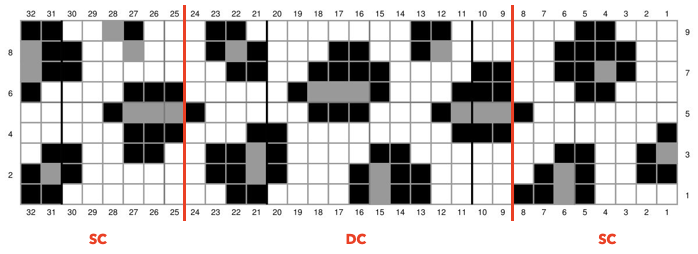 Row 1: Ch 33. Following color changes from chart, sc in 2nd chain from hook and next 7 ch. Dc in next 16 ch. Sc in last 8 ch. (32)