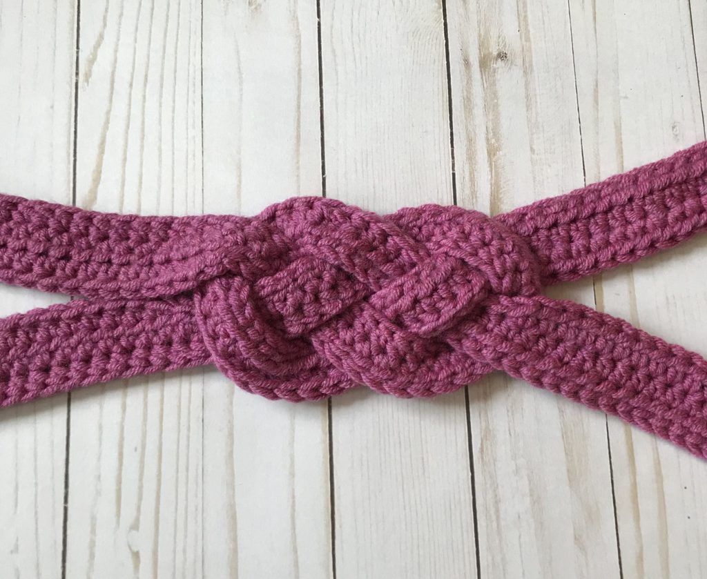 This fun headband features the sailor’s knot. It’s made in two pieces and then seamed together after the knot is done. When I originally designed this, I asked my husband to help me think of a name. He said the knot reminded him of an electrical diagram that he was studying at the time called a crossed pair. And so I went with that.